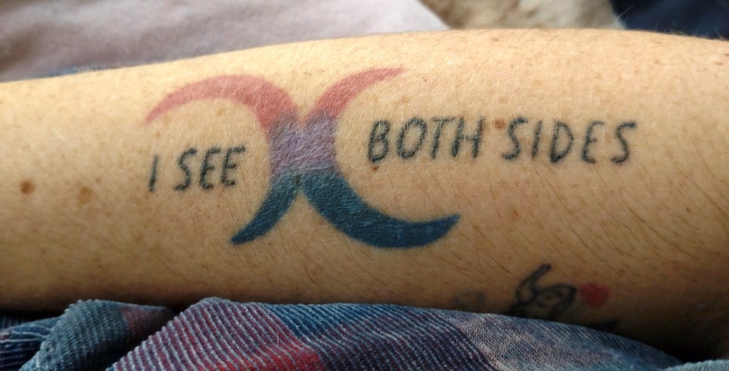 Tout comme les personnes bies en couple gay ou lesbien sont toujours bies. Et les personnes bies célibataires sont toujours bies. Les personnes bies qui n’ont jamais eu d’expériences avec des personnes du même genre sont toujours bies. Et elles n’en sont pas moins queer. Il y a un énorme problème de gatekeeping dans la communauté queer vis à vis des personnes bies. Ces personnes qui décident qui est assez queer pour faire partie de la communauté. Qui gardent les portes pour décider qui peut rentrer ou non. J’ai moi même souffert de ce gatekeeping et il a fallu attendre la prise de conscience de ma non binarité pour que je me sente enfin « assez queer » et légitime à faire partie de cette communauté. Chose que je n’arrivait pas à faire quand je pensais être une femme bie.